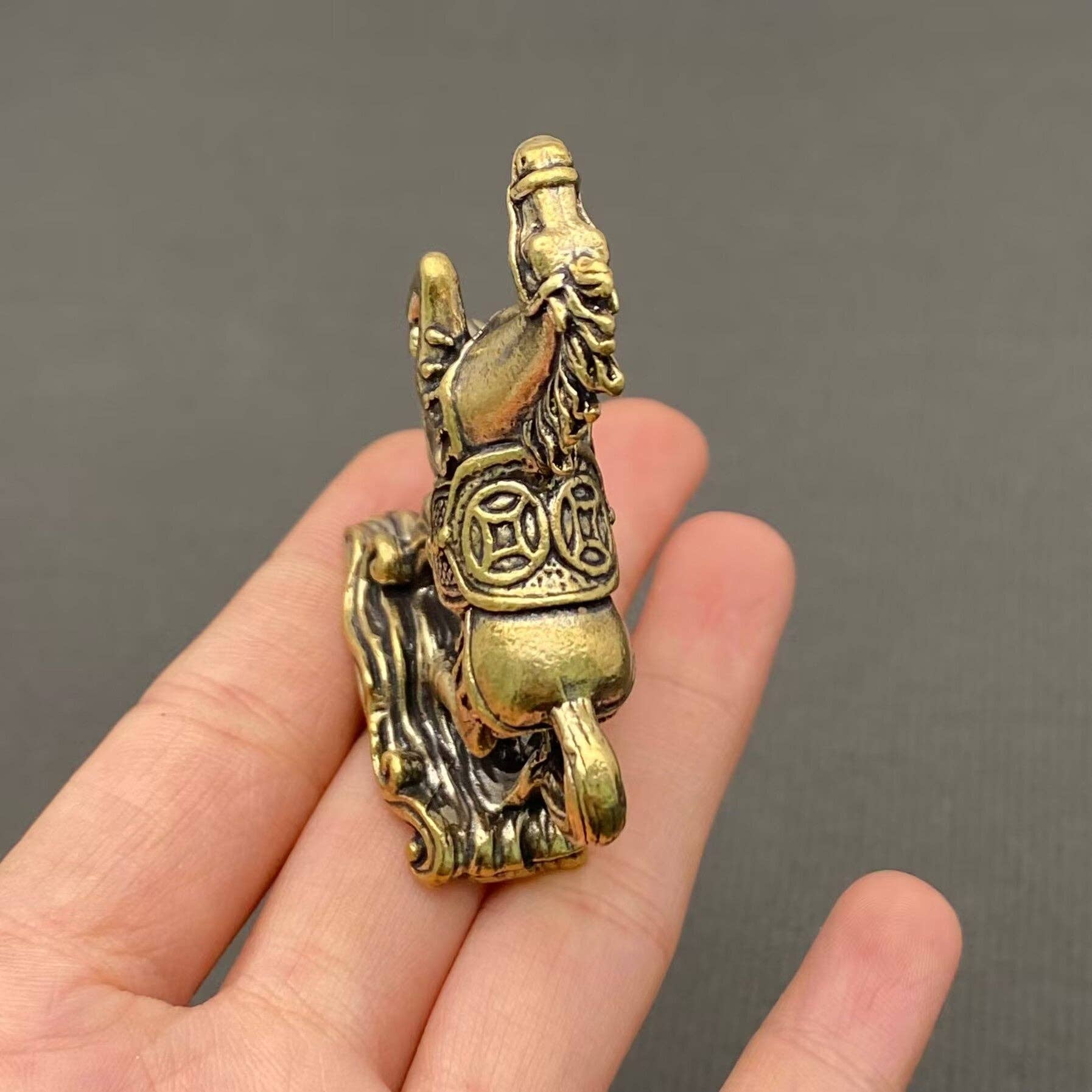 This ornament symbolizes success in China ,'財源廣進' Means that you will get more $ . Type: Desktop ornament Material : Brass Size:50mm*56mm