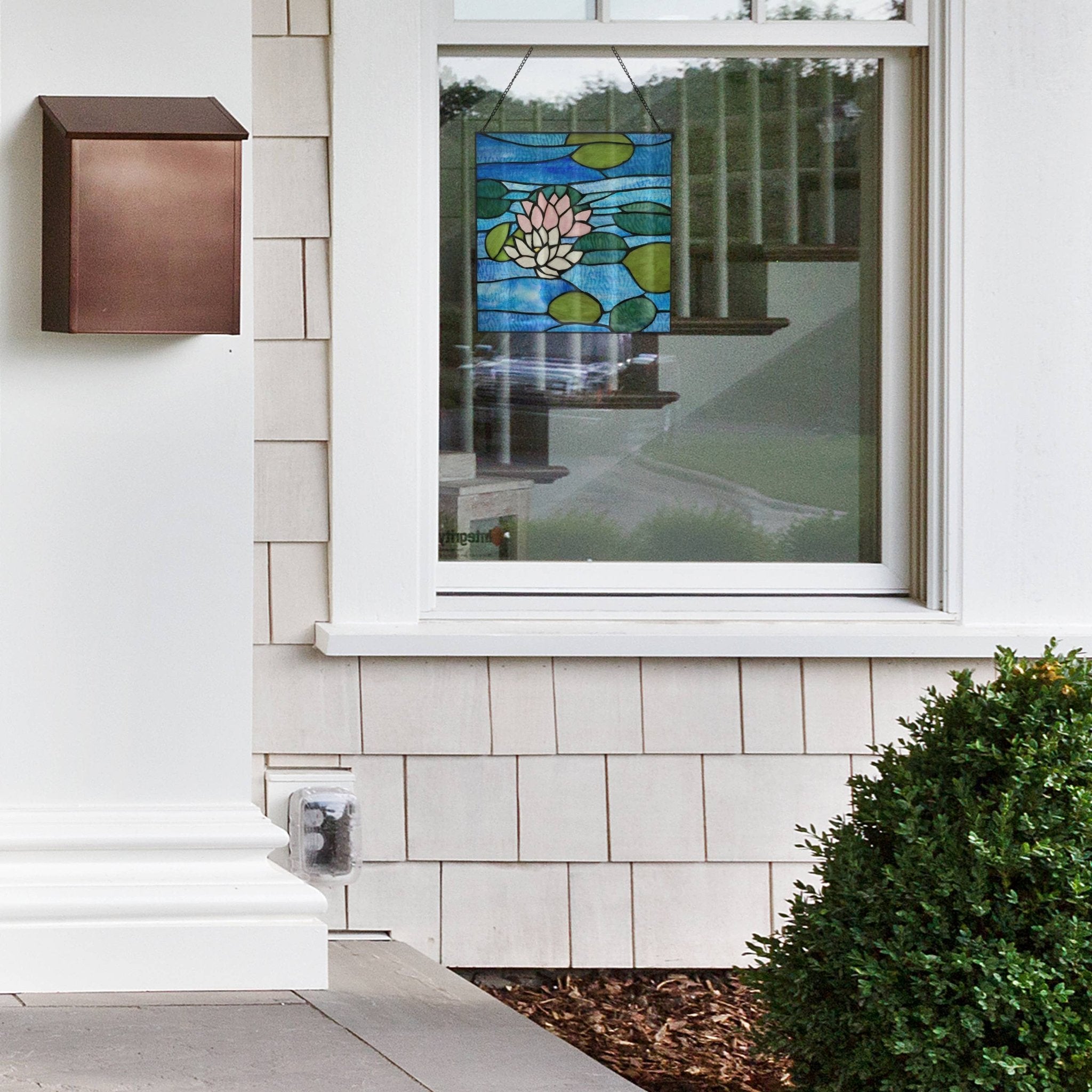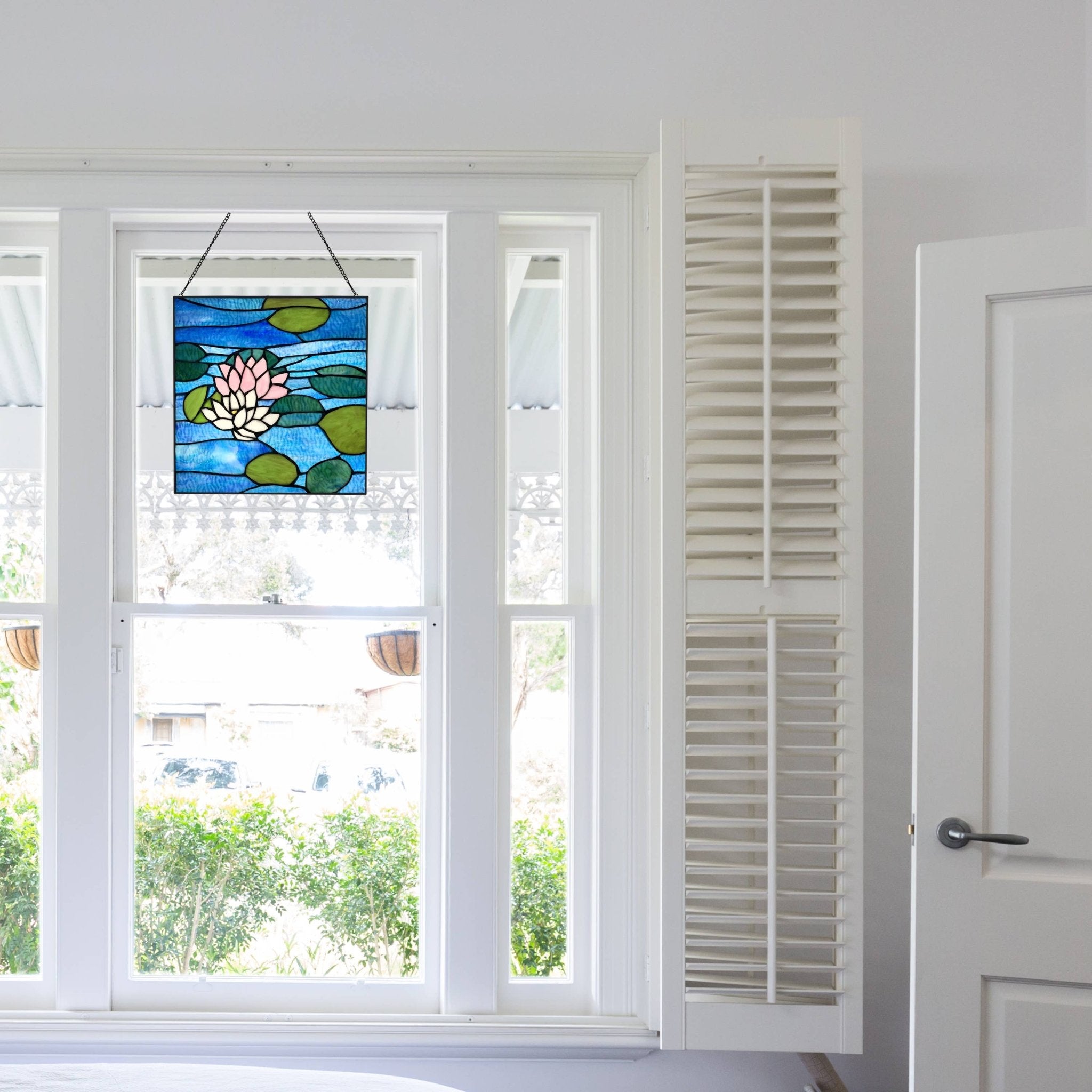This lovely nature-inspired stained glass window panel showcases two lotus flowers floating in a pond. Crafted from 72 textured Tiffany-style glass cuts, it makes the perfect addition to your kitchen, living room or bedroom — anywhere you've got a sunny window that will let natural light filter through. Simply hang it with the included 24" metal link chain and watch your space fill with a colorful kaleidoscope of light.