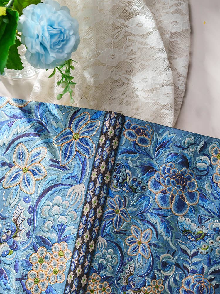 The design reproduced here is taken from a panelled skirt known as a mamianqun, a garment worn by Han Chinese women in the traditional Hanfu dress style. Hanfu dates back more than three millennia to the Song and Liao dynasties, when it became popular due to both its functionality and its aesthetic style.