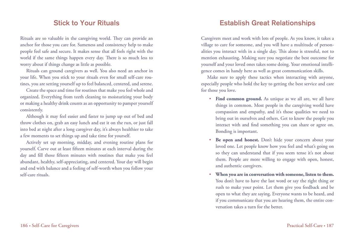 In Self-Care for Caregivers, you’ll find short, easy-to-read—and often easy-to-do—ways to replenish your mind, body, and spirit, including: