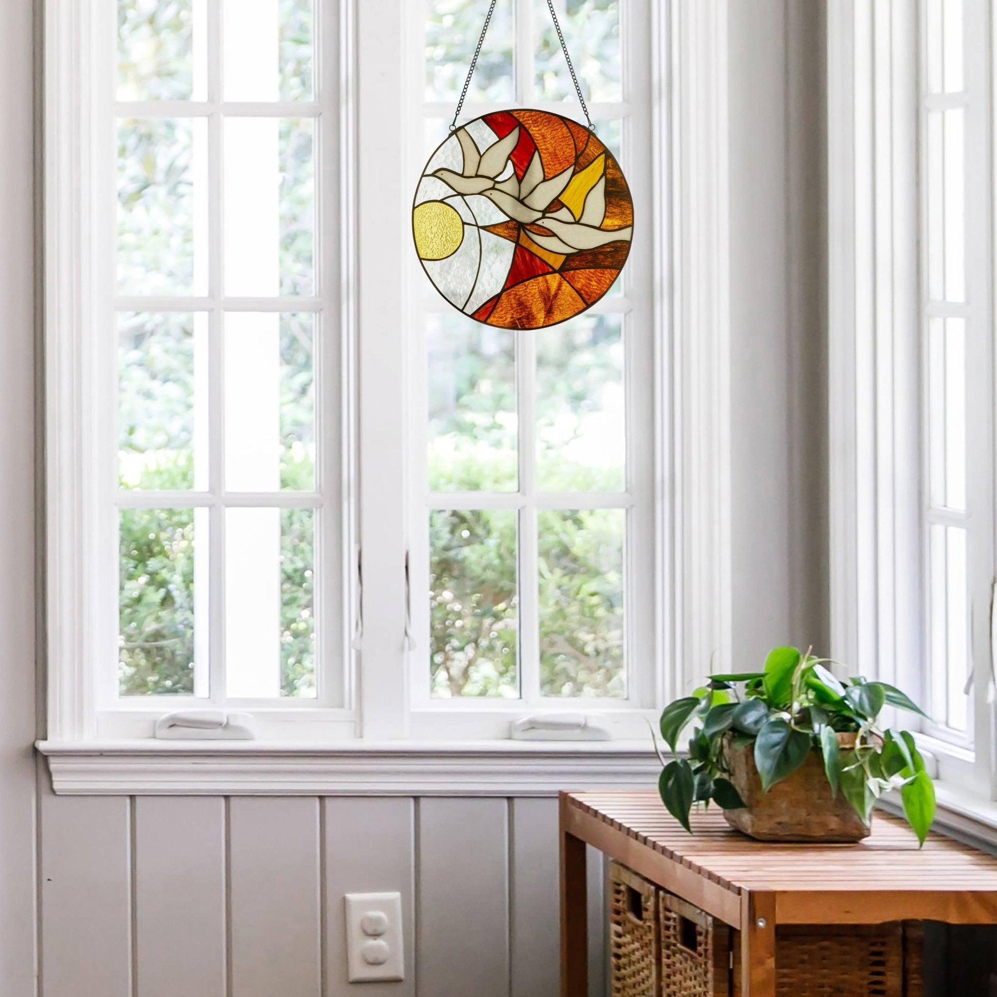 14"H Doves at Sunset Round Stained Glass Window Panel
