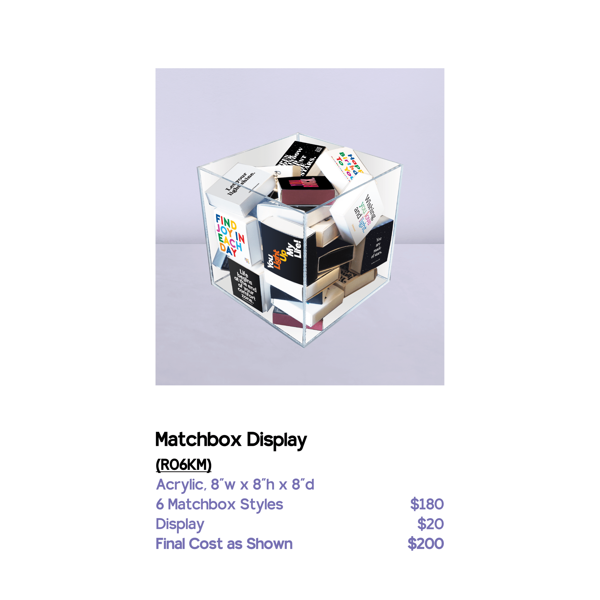 2 3/8" x 2 3/8" x 3/4 matchbox containing 80 black or natural wood matchsticks with coordinating color tips. *See our cube display with best-seller fill under 'collections.'