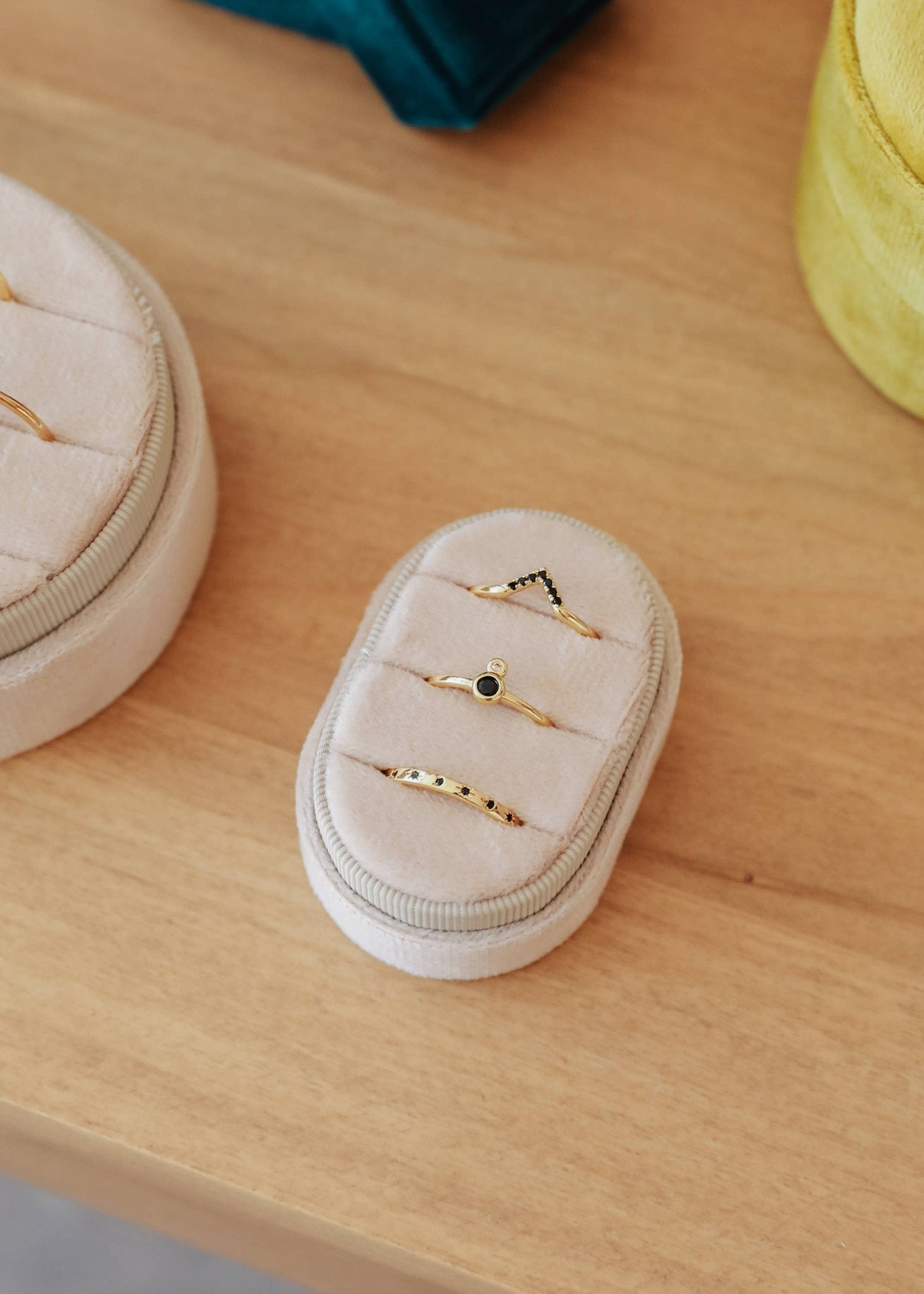 Black tiny moons and stars encircle a band of gold, bringing their ethereal quality into your new favorite ring stack and a gentle reminder to look up and embrace the universe.