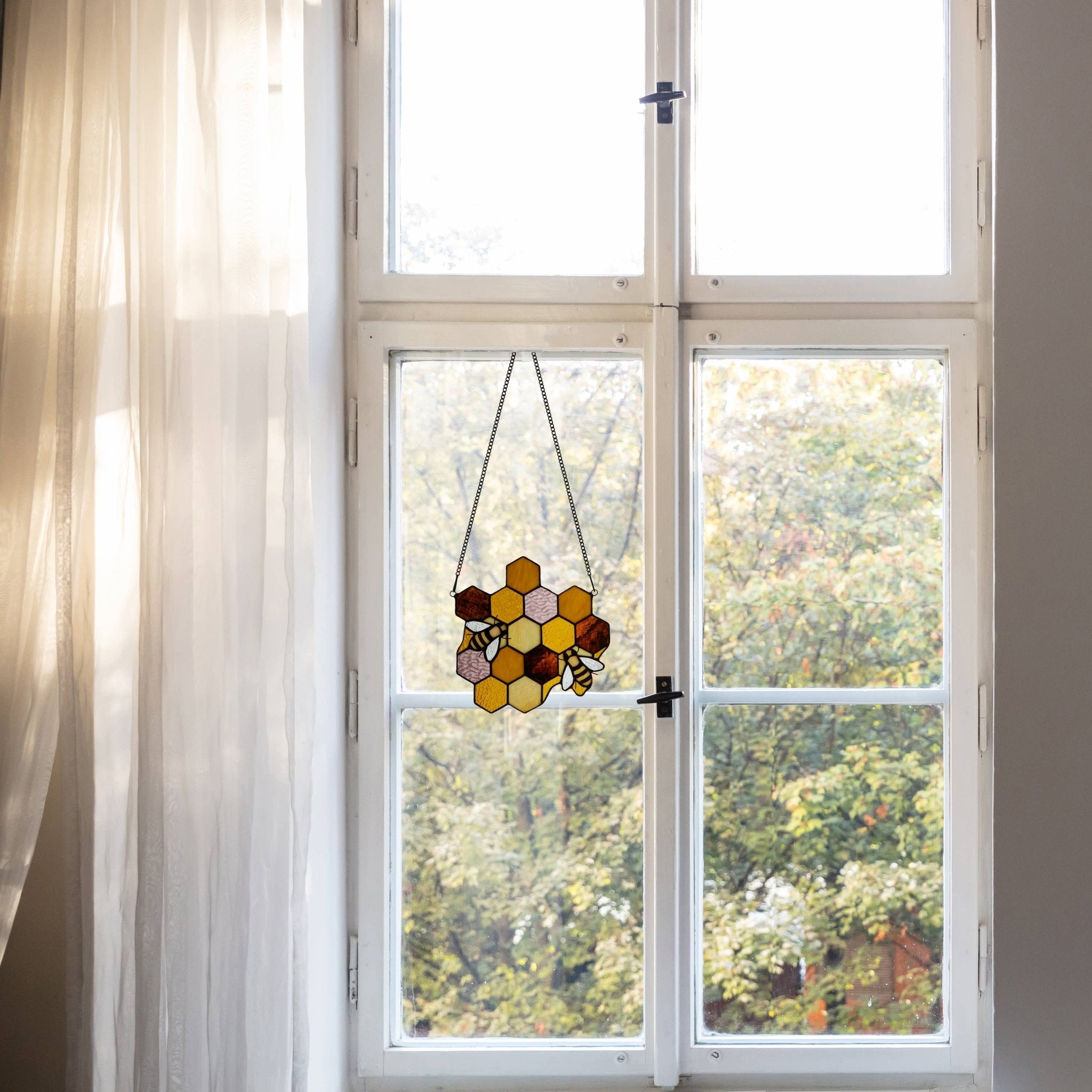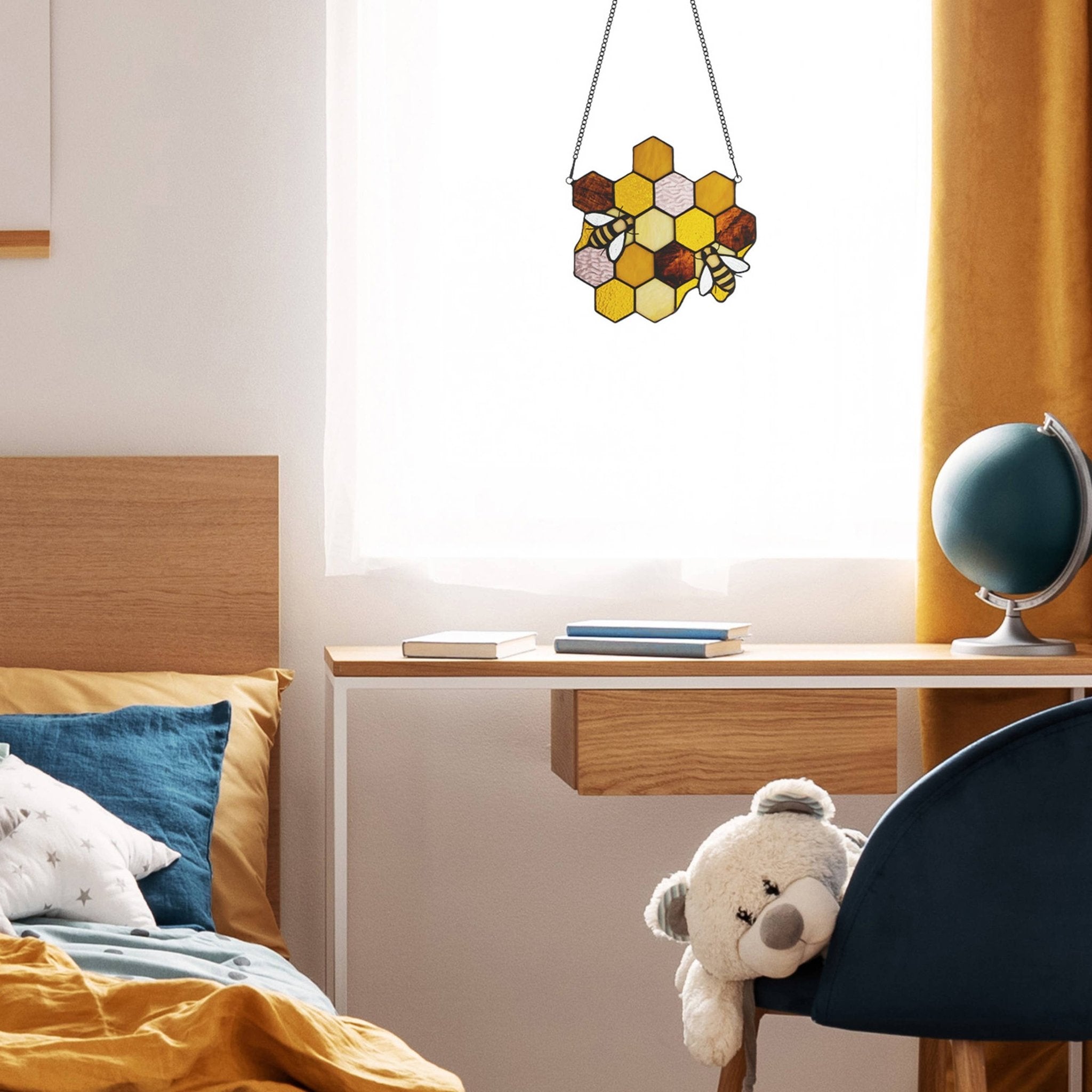 8.25"H Cassie Honeycomb Bees Stained Glass Window Panel