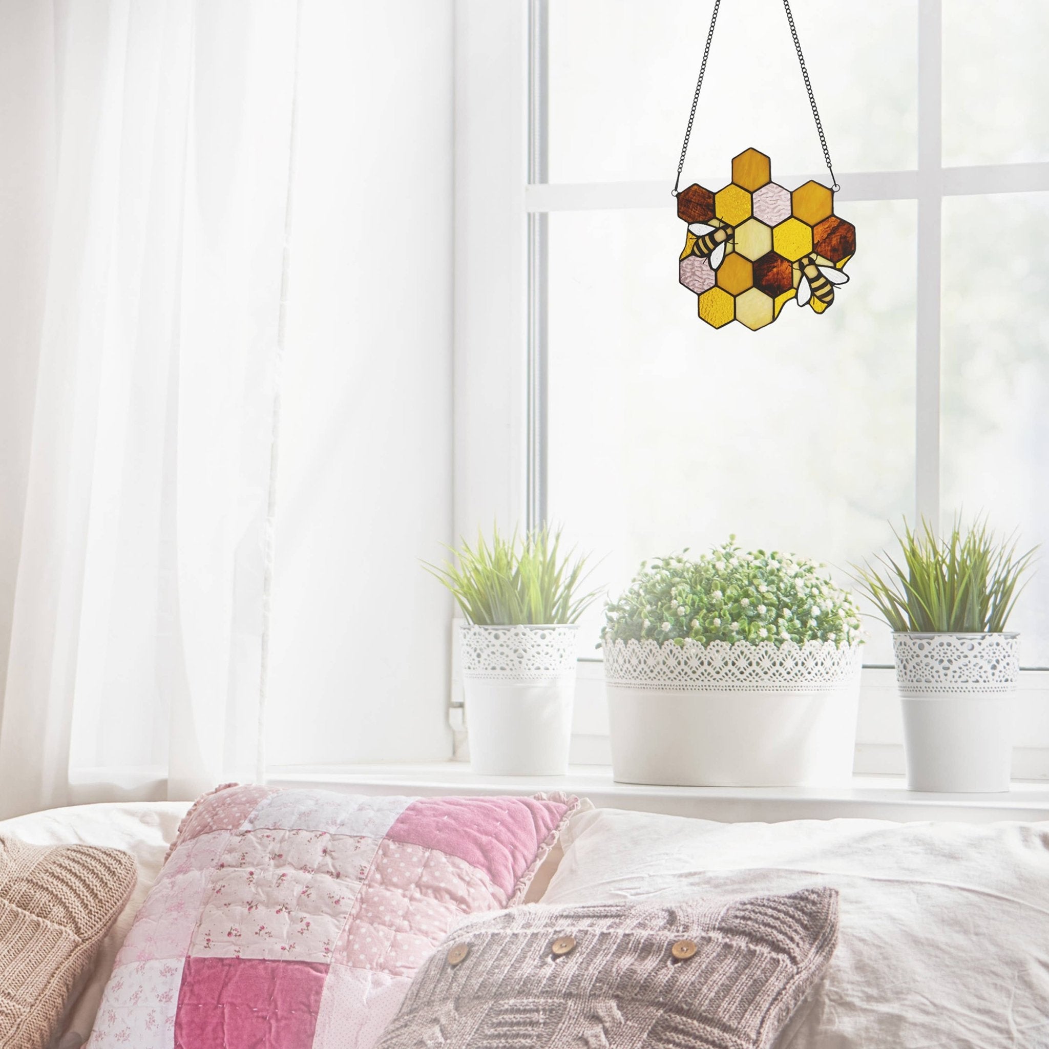 The 8.25"H Cassie Honeycomb Bees Stained Glass Window Panel from River of Goods is sure to bring a buzzworthy accent to your home décor. This unique stained glass depiction of a honeycomb with two busy bees is composed of 29 individual glass cuts in yellow, amber & brown hues set against a translucent background. The metal link chain atop the hexagonal glass cuts & iron frame allows for immediate hanging in your living room, kitchen or bedroom — just be sure to place it in a window that gets plenty of sun to see the colors intensify as it catches the light.