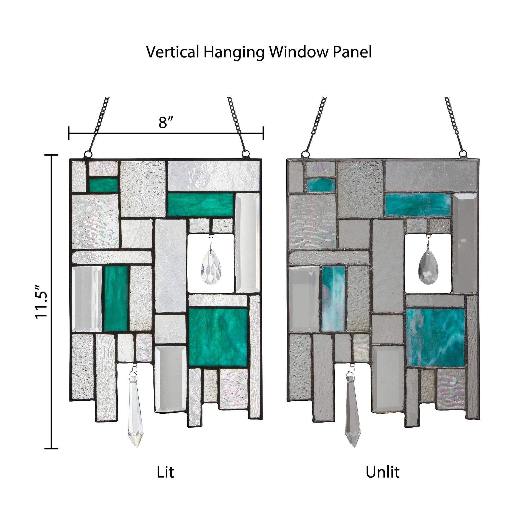 Add sparkle to your home with the 11.5"H Molly Turquoise Suncatcher Stained Glass Window Panel from River of Goods. This stained glass panel is crafted with square and rectangular shapes for a geometric style, making it a versatile piece for hanging in any window in your home. It’s composed of 28 individual glass cuts in turquoise, set against a translucent background of clear textured Tiffany-style glass. Plus, two clear crystals dangle from the panel to create a beautiful bejeweled look. The metal link chain allows for immediate hanging in your living room, kitchen, bedroom, or wherever you wish — just be sure to place in a sunny window to see the color intensify as it catches the light.