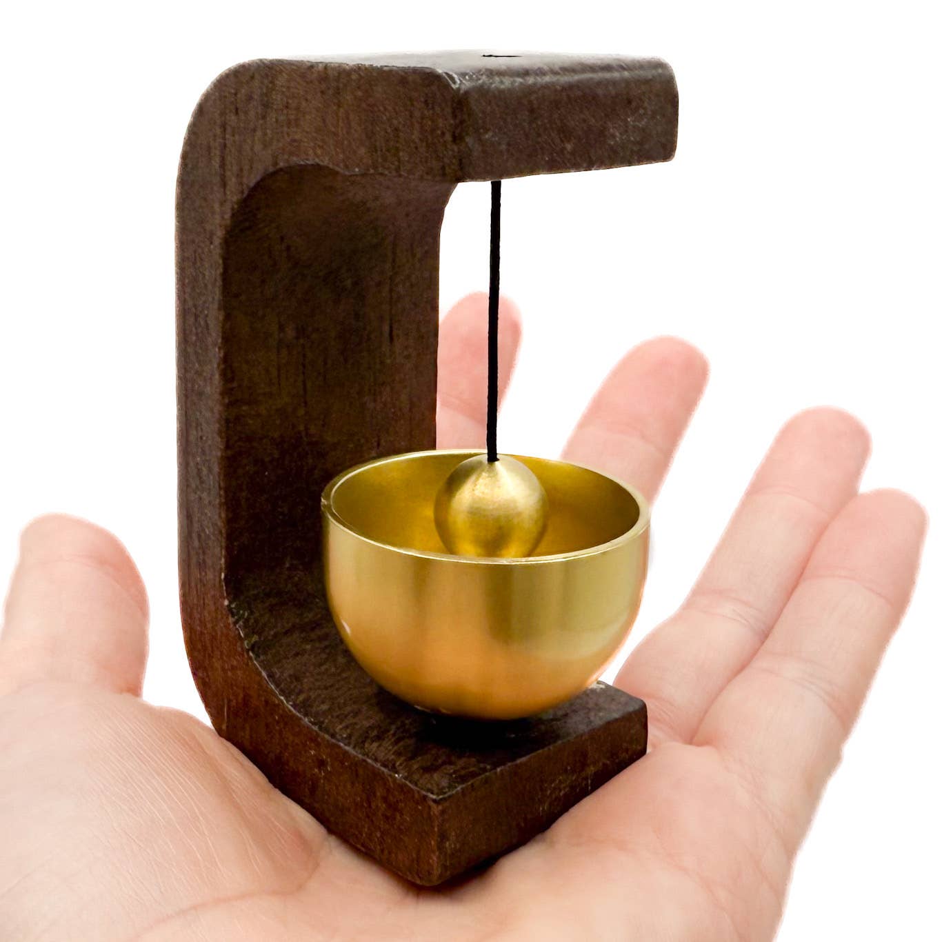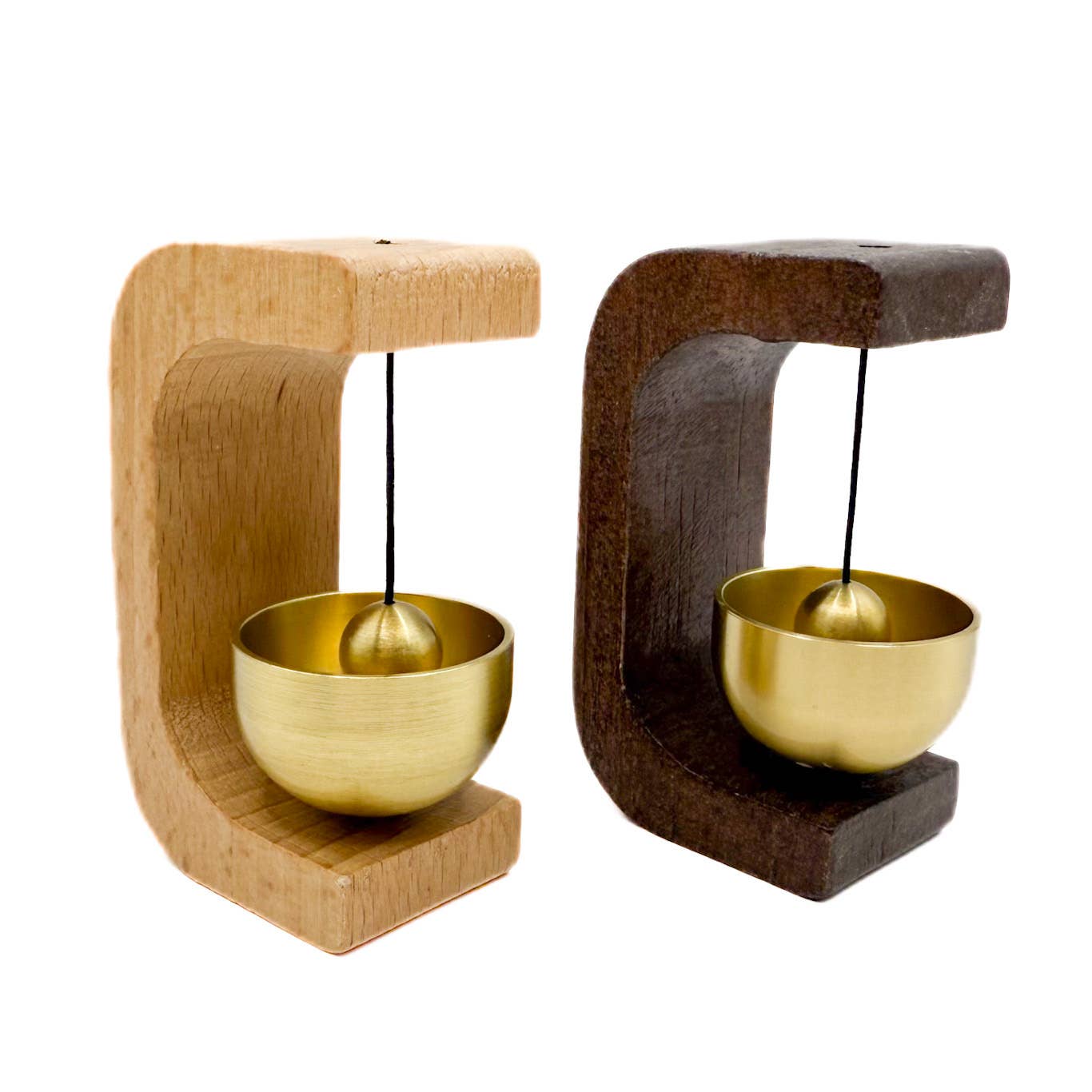 Solid wood with metal chime and bowl. These sweet chimes can be put on anything that moves - doors, cabinets, etc. They make a sweet ringing sound. There are 2 strong magnets embedded on the back or you can use the (included) self-adhesive foam strip to attach them to non-magnetic surfaces. Measures about 3" x 2.75 x 1.25".